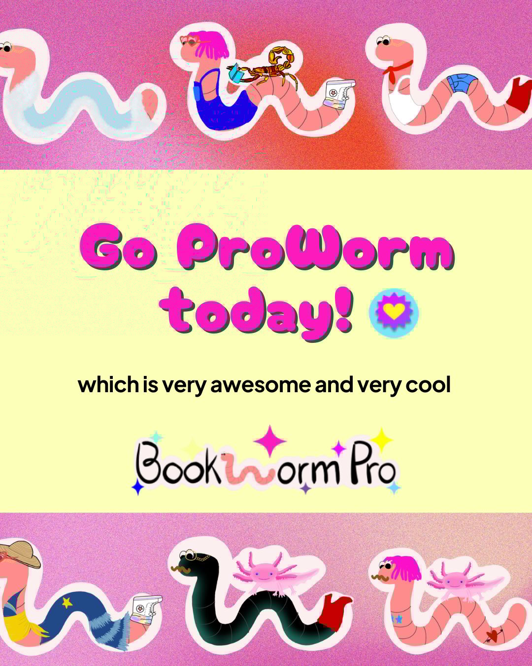 Why go ProWorm?? 📊 personalized reading stats that you can review and share anytime. 🌈 customize your worm with fun colors and choose a bestie for your worm (!!) 🌟 invest in a reader-centric book community that stands against Amazon 👑 priority support from our dedicated team. | ![]() |